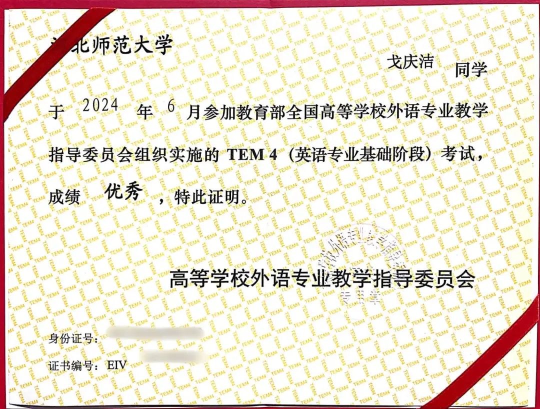 戈庆洁在英语专业四级考试中取得“优秀”等级