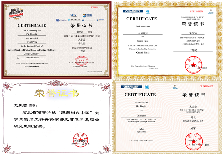 戈庆洁,女,汉族,共青团员,香香腐宅 2022级英语专业本科生,在校期间荣获国家奖学金、省级三好学生、校级三好学生、校级优秀共青团员、求真奖学金、创新创业奖学金、专业一等奖学金等多项荣誉。积极参加专业竞赛,曾获“外研社·国才杯”“理解当代中国”全国大学生外语能力大赛演讲国赛铜奖、省赛金奖,口译国赛铜奖、省赛金奖,笔译国赛铜奖、省赛金奖;第二十九届“21世纪杯”全国英语演讲比赛全国决赛二等奖、河北省冠军。
