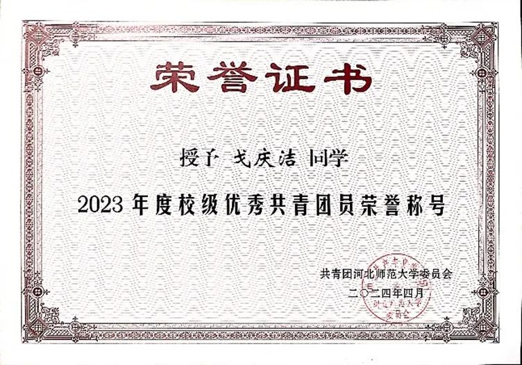 喜报||祝贺我院学子戈庆洁荣获“河北省青年五四奖章”!