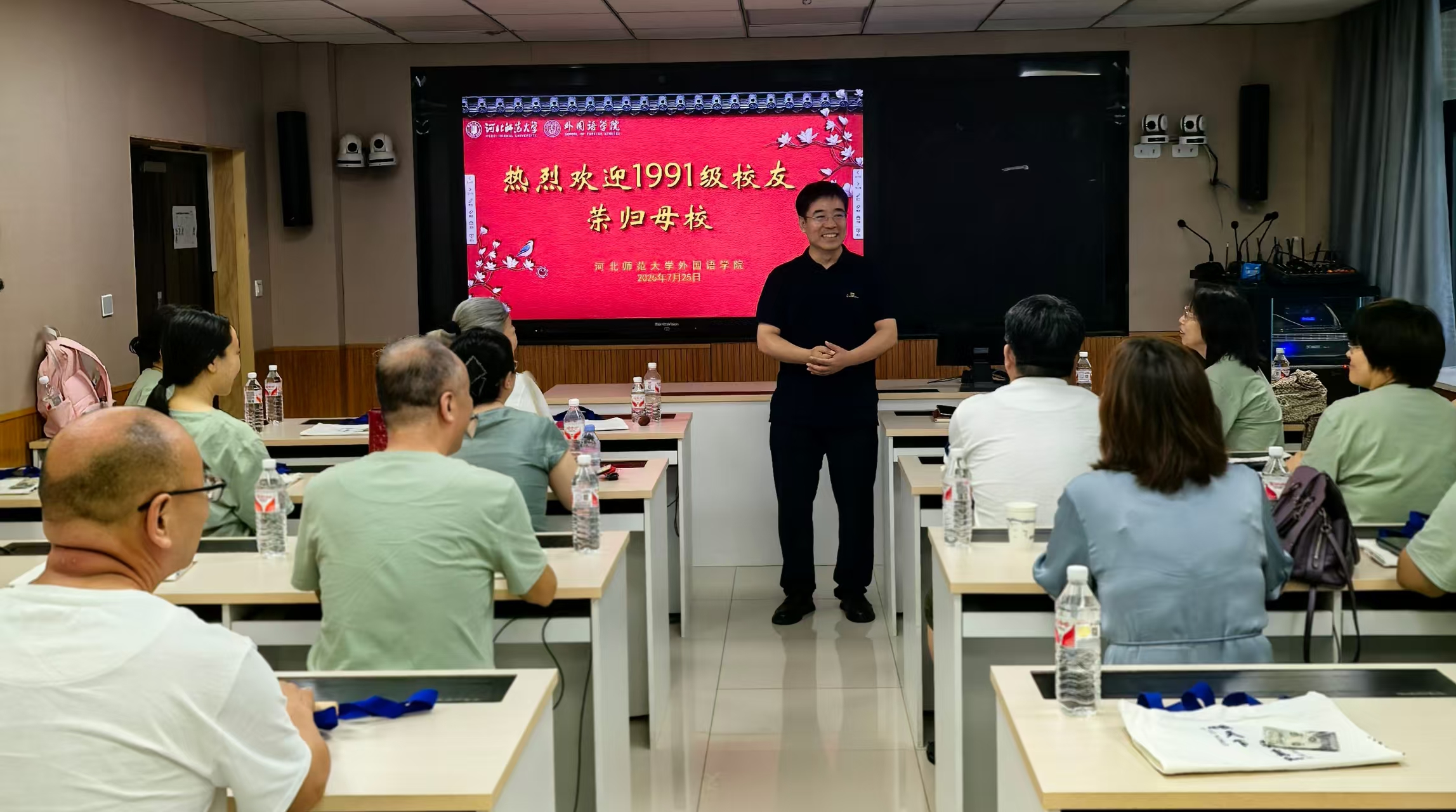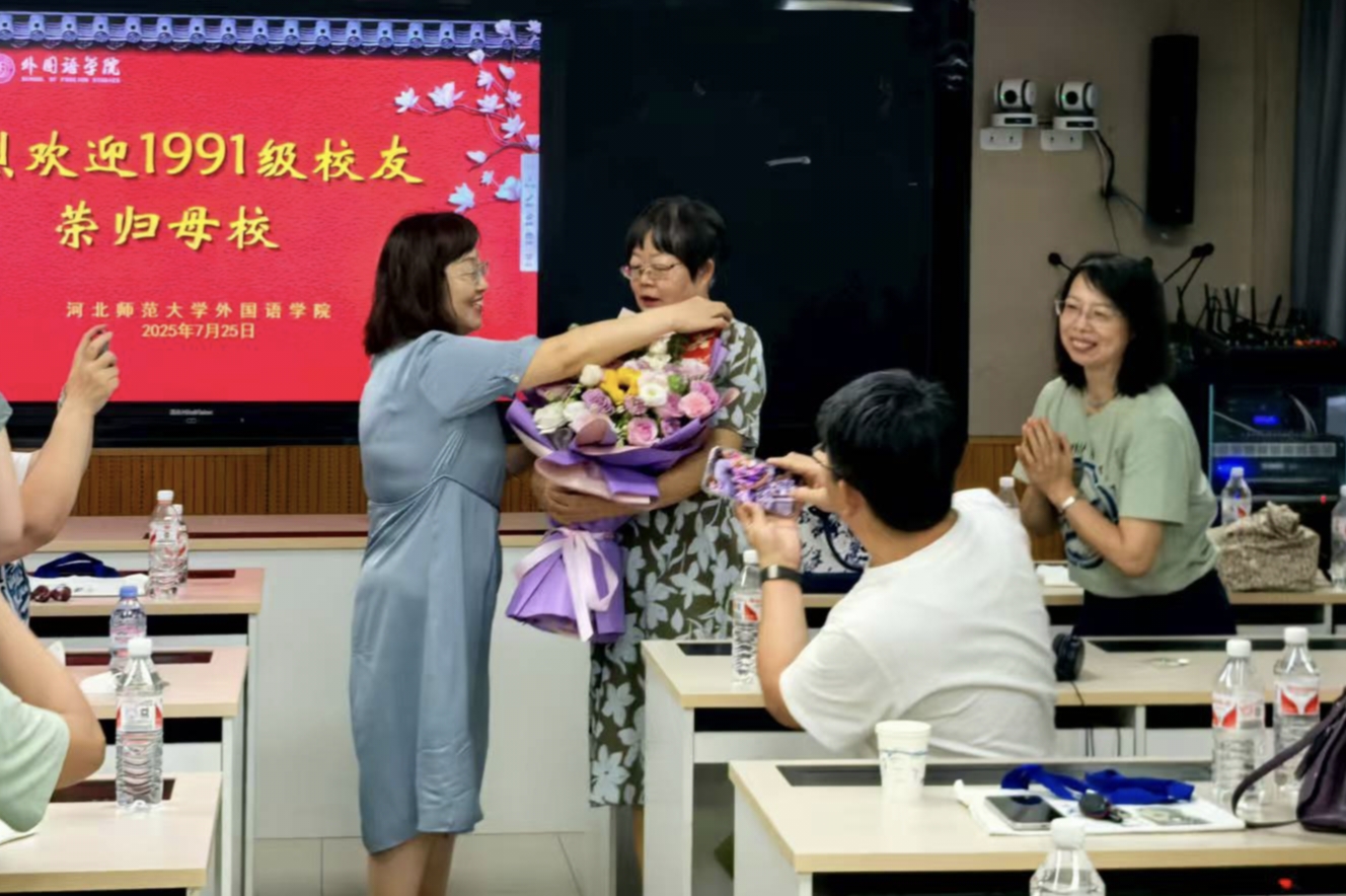 2025年7月25日,我院英语专业1991级(河北师范学院)27名校友返校,在文科B114室参加毕业30周年座谈交流会。学院院长王洪庆、学院党委副书记霍晨静、时任专业教师马丽莉教授出席。
